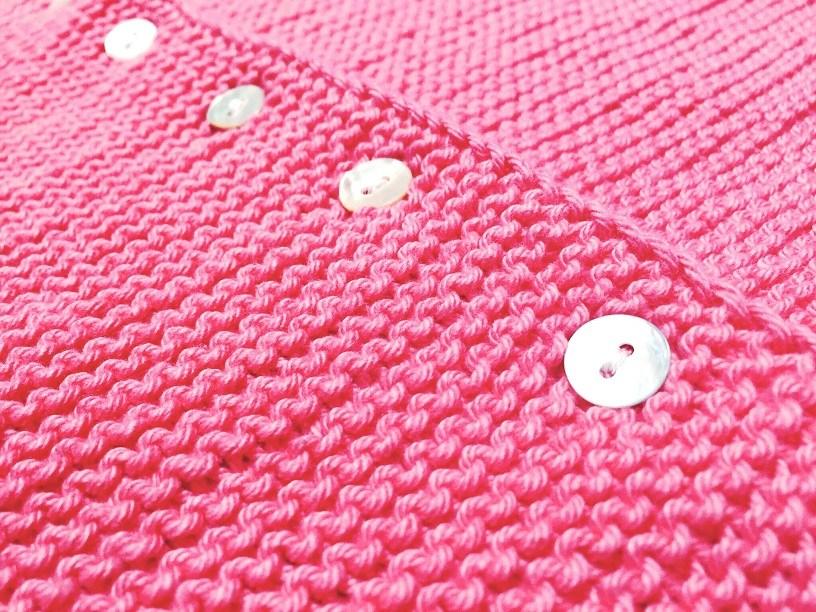 Escondemos todas las hebras.Cosemos siete botones, a la altura de los ojales que hemos ido tejiendo a lo largo de todo el cuerpo de la chaqueta.