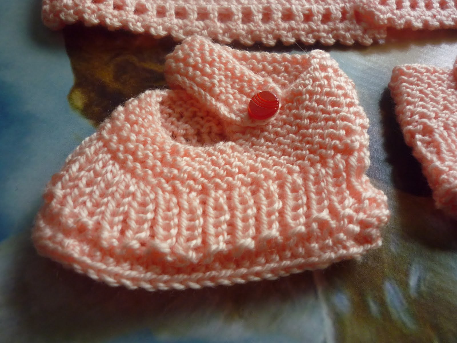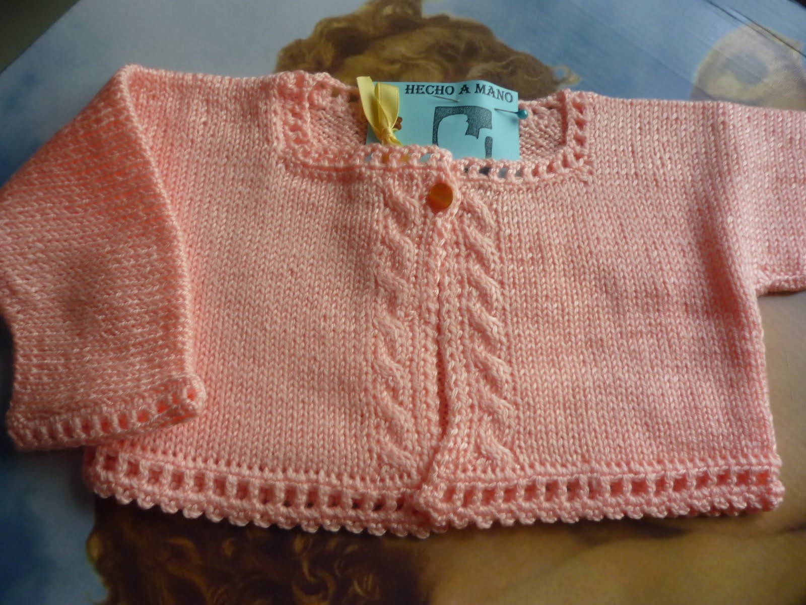 Y lo otro que terminé es más específico para nenas. Es una chaqueta de lanita para bebé en blanco roto y perlé rosa. Reversible: se puede atar delante o detrás. Se ajusta a los bracitos y a la cintura con lazos a juego. Zapato-botita a juego. Aunque la talla es de 0 a 2 meses, creo que es para nenas más grandes. Precios: ...