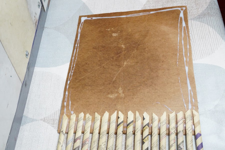 Esto lo realizaremos en todo el contorno del cartón y dejaremos secar, puedes apoyarte con pinzas de ropa u objetos pesados para que no se despegue mientras seca.