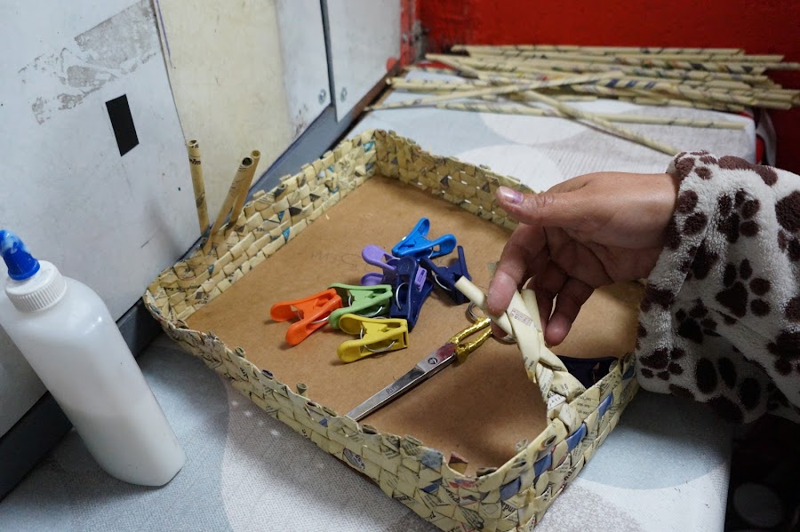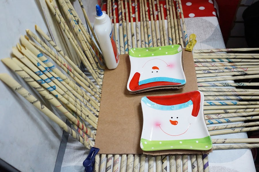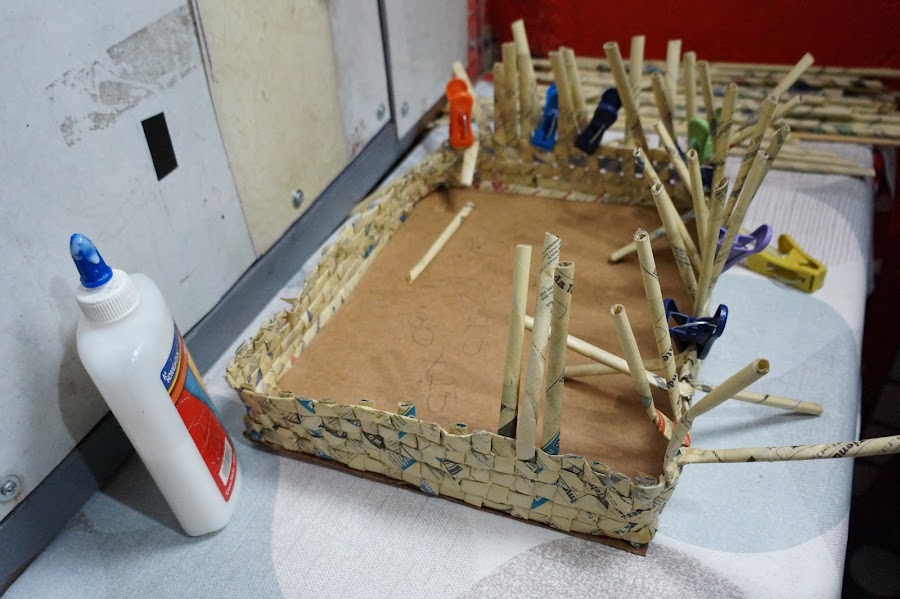 Ahora trenzaremos estos palitos de papel, y añadiremos en ellas otros más, para completarlo y as´poder hacer las asas para sostenerlo. Lo pegaremos y dejaremos secar, lo mismo haremos con el segundo
