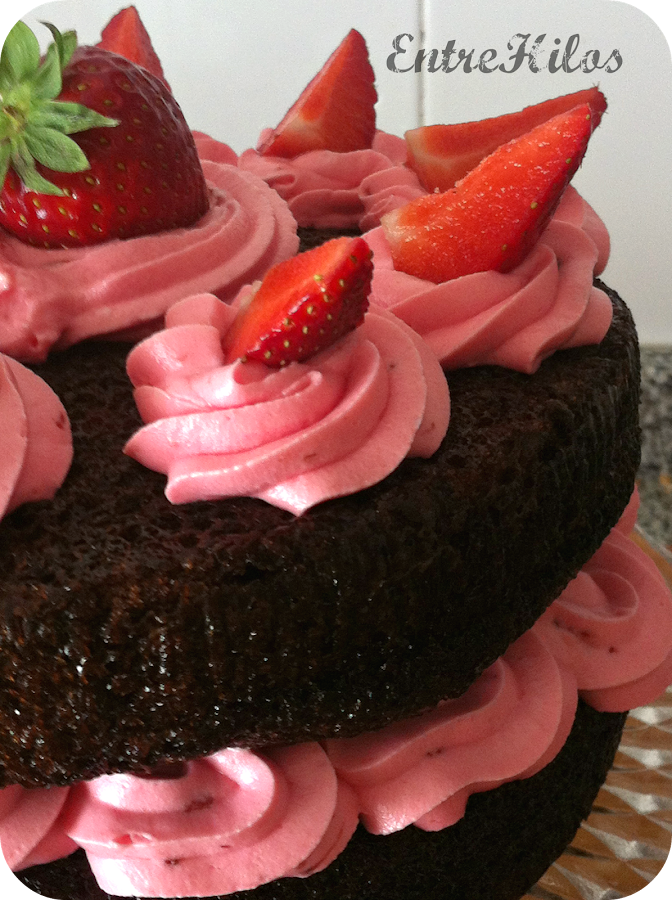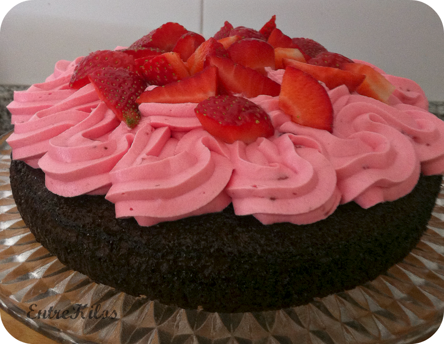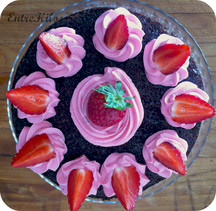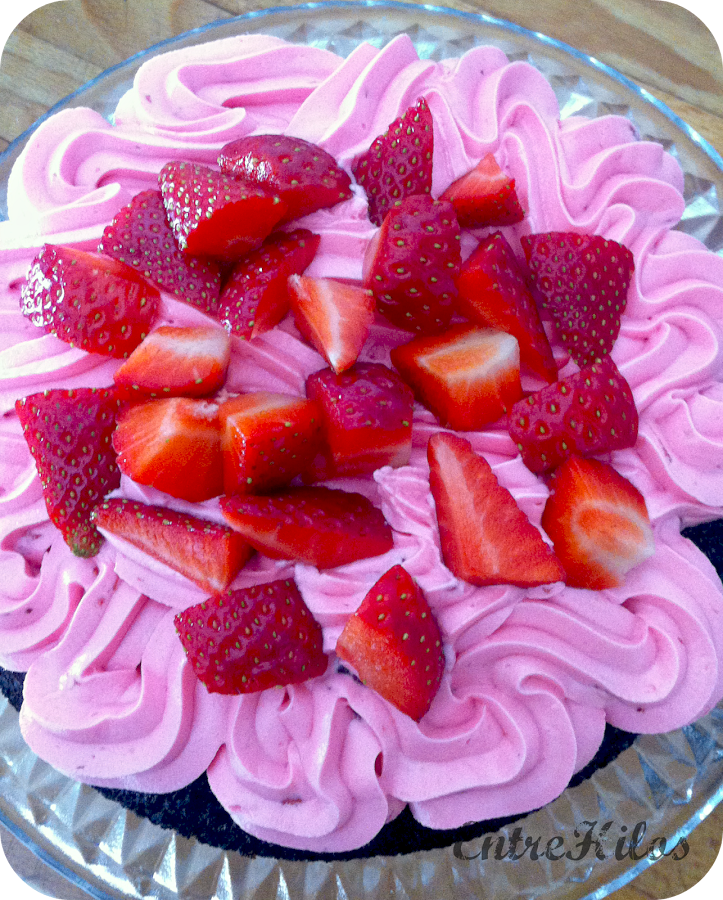 Le puse unos rosetones de cheesecream bordeando la tarta, con un cuarto de fresa encima. Y en el medio, un rosetón más grande con una fresa entera.