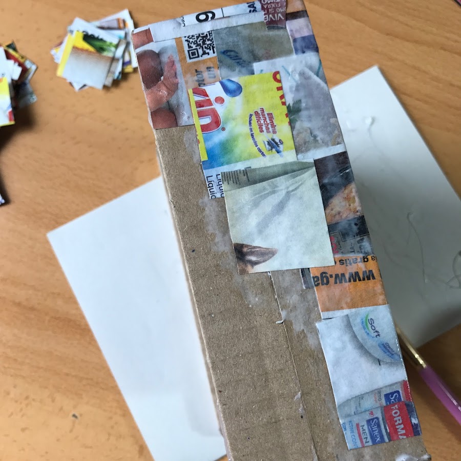 Una vez hecho esto necesitamos que la estructura se haga más fuerte y soporte peso, decoración, pintura... para ello recortamos papelitos (yo uso los folletos de publicidad) y con una mezcla de agua y cola blanca los vamos pegando por toda la superficie de la chimenea.