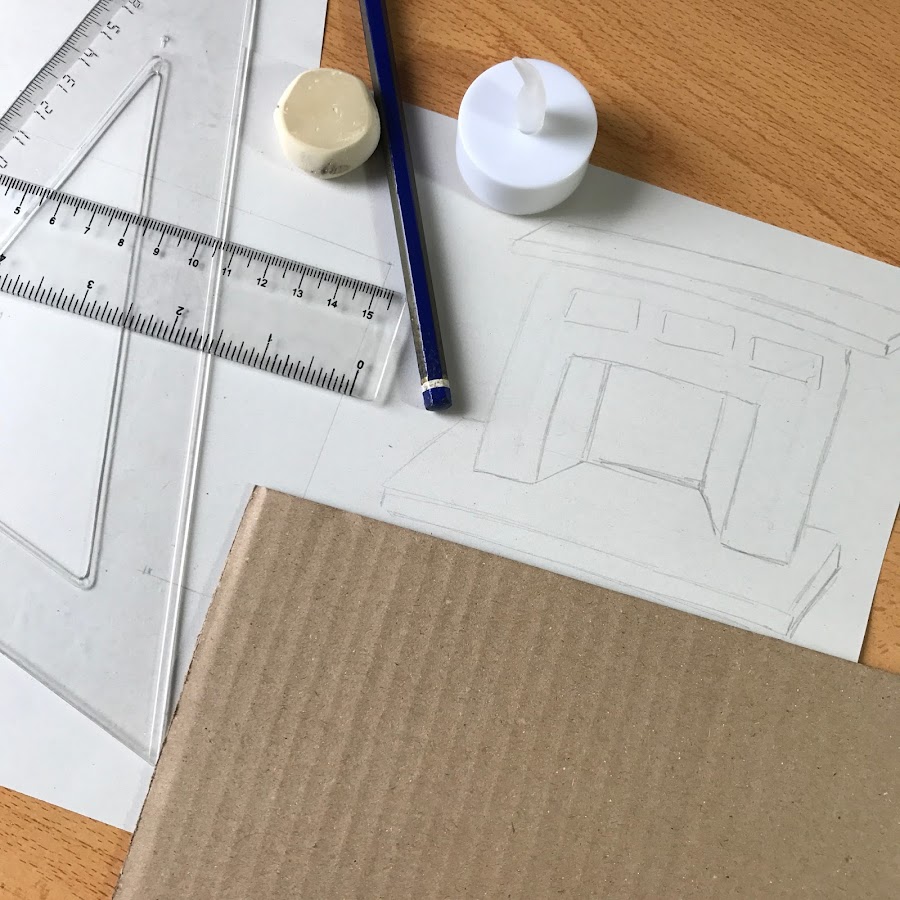 Yo siempre empiezo haciendo un esquema de como quiero que sea en este caso la chimenea y tomo medidas de las muñecas para no pasarme de grande o de pequeño.
