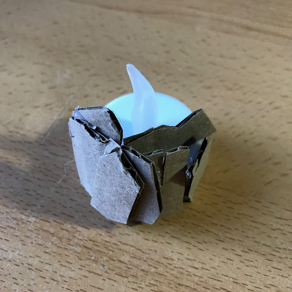 Se me ocurrió un invento para hacer el fuego, he usado una vela led y le he puesto trocitos de cartón recortados y pegados con silicona, después los pintaré imitando troncos de madera.