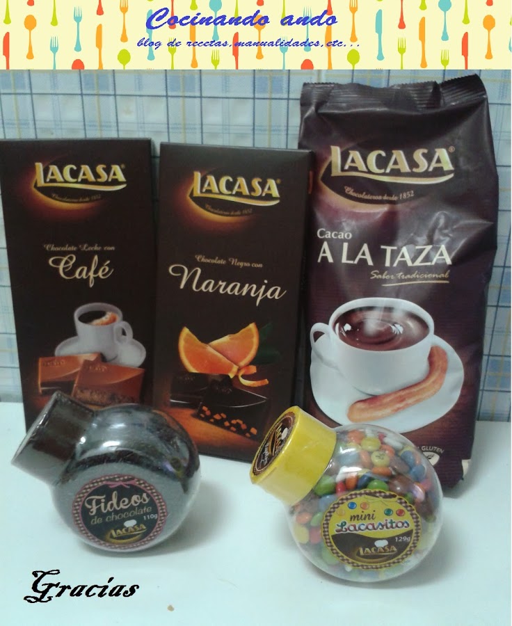 HOLA AMIGOS,AYER NOS LLEGÓ ESTE SUPER LOTE CORTESÍA DE LACASA ,EL LOTE SE COMPONE DE :CHOCOLATE CON LECHE SABOR CAFÉ,CHOCOLATE NEGRO CON NARANJA,UN PAQUETE DE CACAO A LA TAZA,UN BOTE DE FIDEOS DE CHOCOLATE ESPECIAL REPOSTERÍA Y OTRO DE MINILACASITOS ESPECIAL REPOSTERÍA...TODA UNA TENTACIÓN SI ESPERO MUCHO A HACER LAS RECETAS VEO QUE ME QUEDO SIN ELLOS ESTÁN RIQUÍSIMOS