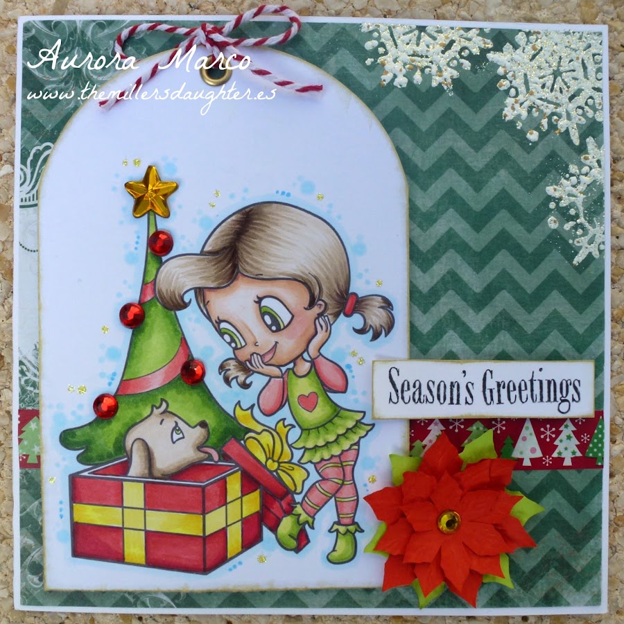 In this card: Digital stamp by Aliciabel, BoBunny"s patterned papers Silver and Gold Collection, washi tape, paper poinsettia, baker"s twin, eyelet, sentiment and snowfalke clear stamps, blings, embossing enamels, gloden ink, glitter glue.