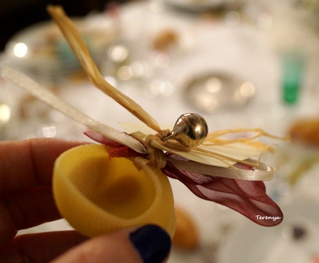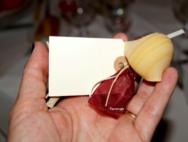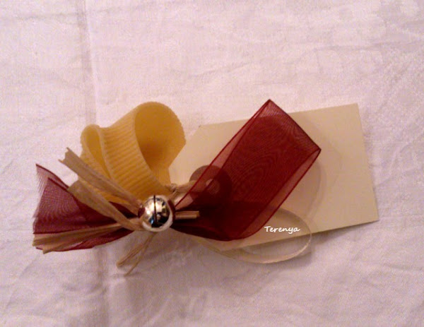 pasta de galets, rafia, cinta de organza y raso, cascabeles y etiquetas.