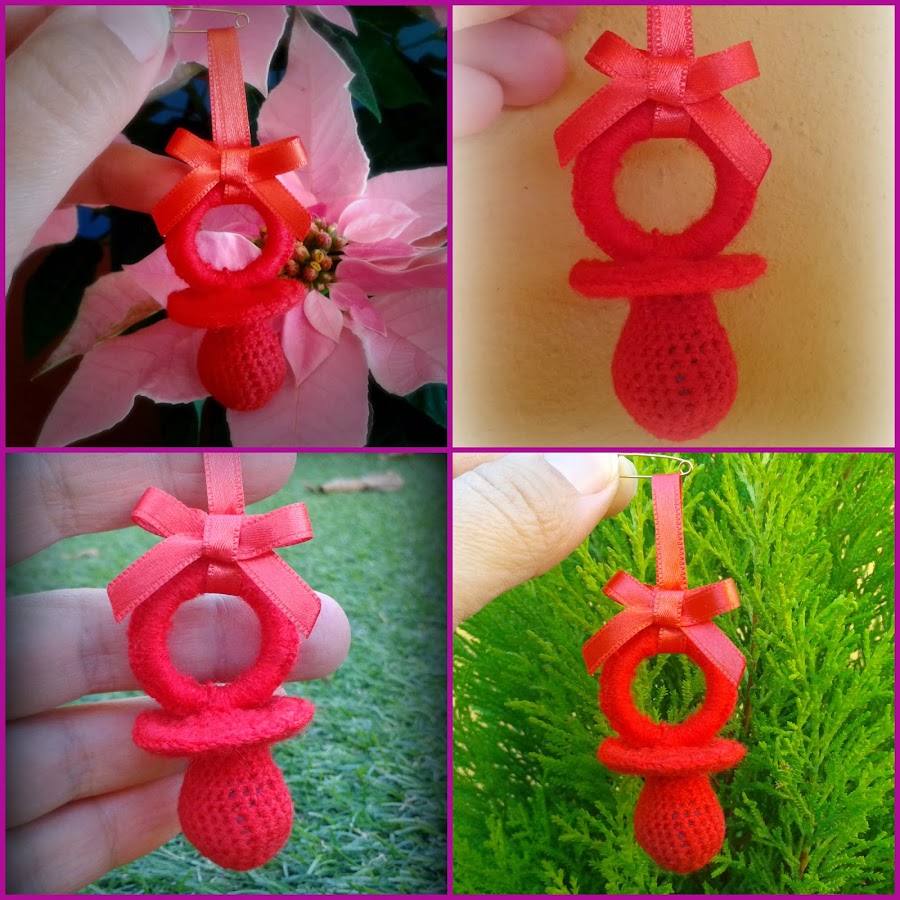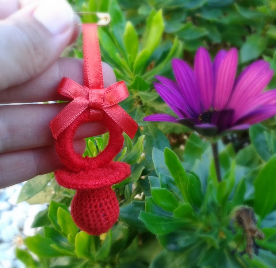 En la entrada de hoy os traigo el regalo que le hice a una amiga que va a ser mamá. Es un chupete de ganchillo con lacito en rojo para colocar en el carrito del bebé. Tengo que decir que es el primero que hice y la verdad es que me costó mucho de hacer porque, al ser tan pequeñito, los puntos no se ven con facilidad y es bastante laborioso, pero creo que al final me ha quedado muy bien porque ¡a mi amiga le ha gustado muchísimo!. Espero que os guste: