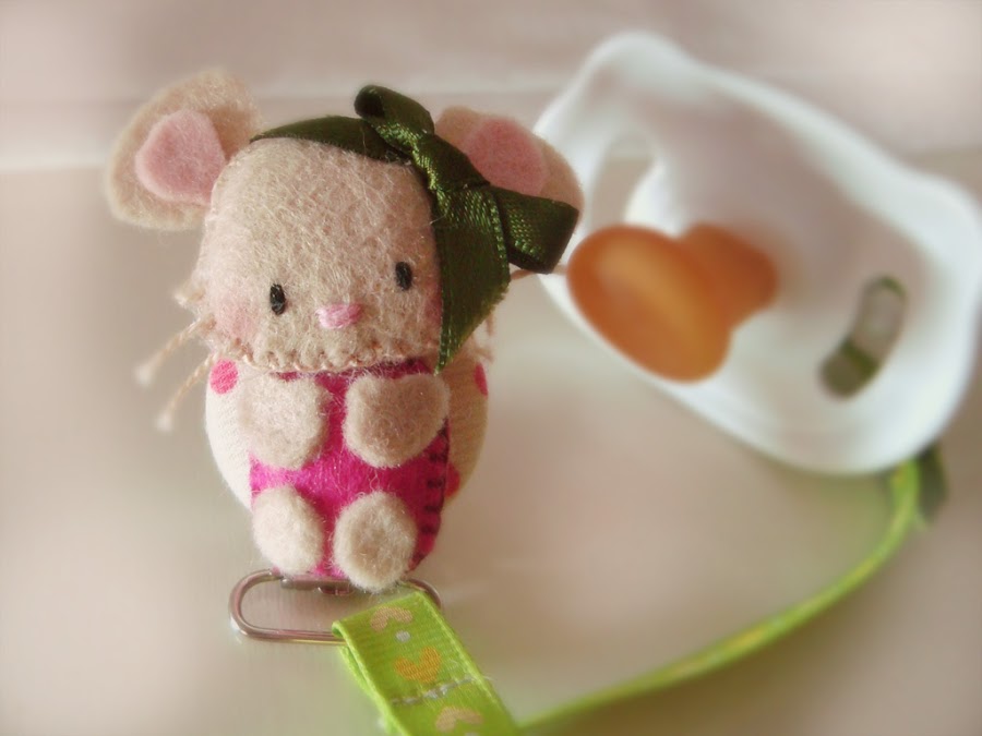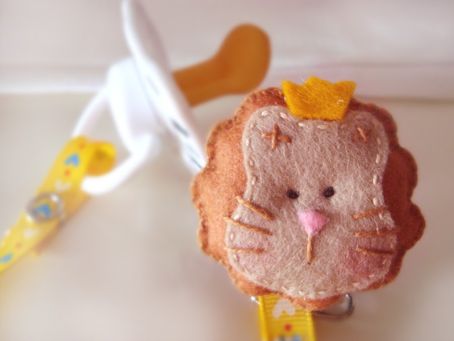 Chupeteros de un león y una ratita en fieltro pegados a un botón forrado con tela.