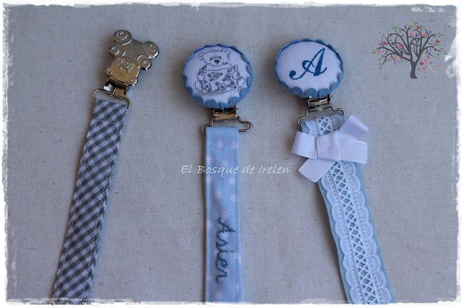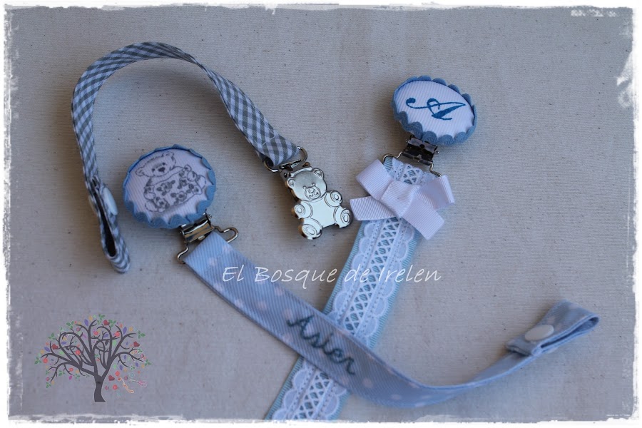 Estos son para Asier, que todavía no ha nacido. Su mamá estaba buscando chupeteros que fueran diferentes y originales y ha tenido clarísimo como los quería. Yo estoy muy contenta con el resultado y a la futura mamá le han encantado. Esperamos y le deseamos que todo vaya muy bien y sean muy felices con el pequeño Asier.