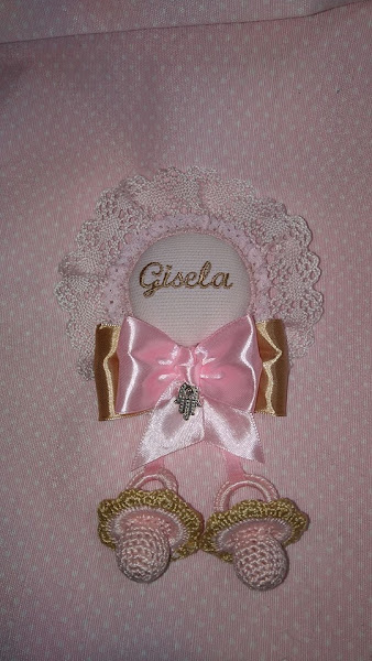 Ella se llama María del Mar y la podeis encontrar también en Facebook. Y cuando le entrego los chupetes hace estas medallas tan bonitas.