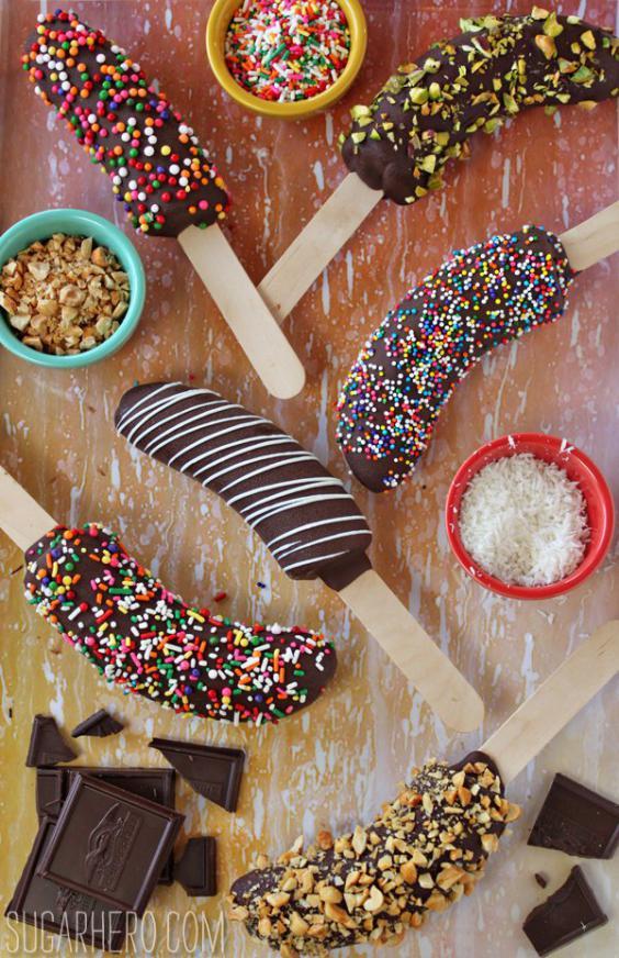Tomar una banana y colocarla dentro del chocolate para bañarla por completo. Escurrir rápidamente y espolvorear con nueces, sprinkles, o lo que te guste.