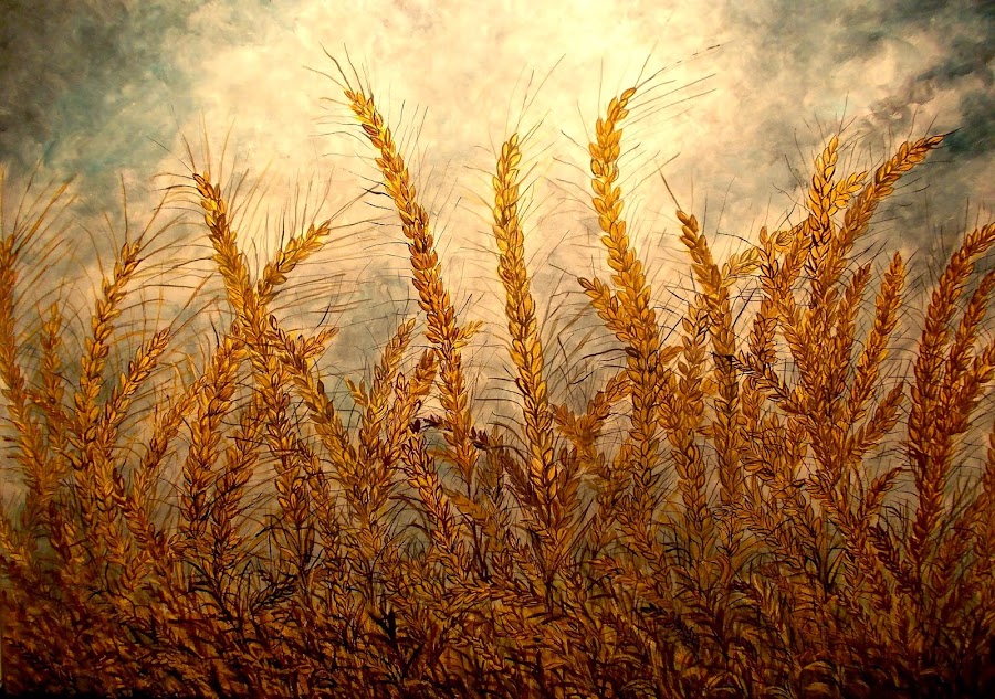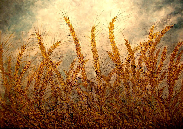 Arub Aisha Que maravilloso cielo, nuestra artista Maria Luisa Palomo, nos ha traído esta obra, cómo siempre, maravillosa, mira que hermoso está el cielo, casi cubierto por nubes, tienen hermosos reflejos, el sol se esconde tras ellas y les da hermosos colores, el aire mueve el trigal, que con sus formas perfectas parece que están danzando, dando gracias al creador porque su color dorado les está indicando a todos que habrá muy buena cosecha. Nuestra artista" María Luisa Palomo, nos demuestra su talento y su experiencia, pues con suma sencillez y muy poco colores, nos ha traído una gran obra, que como siempre plan firma con su sello de excelencia y perfección