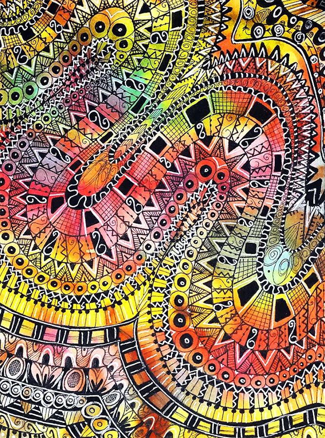 Sobre papel de acuarela tintado con anilinas hemos dibujado las cintas y los doodles con rotuladores negros de diferentes grosores y hemos dado luz con rotulador blanco. Hemos seguido el patrón que las cintas nos marcaban para obtener el movimiento.