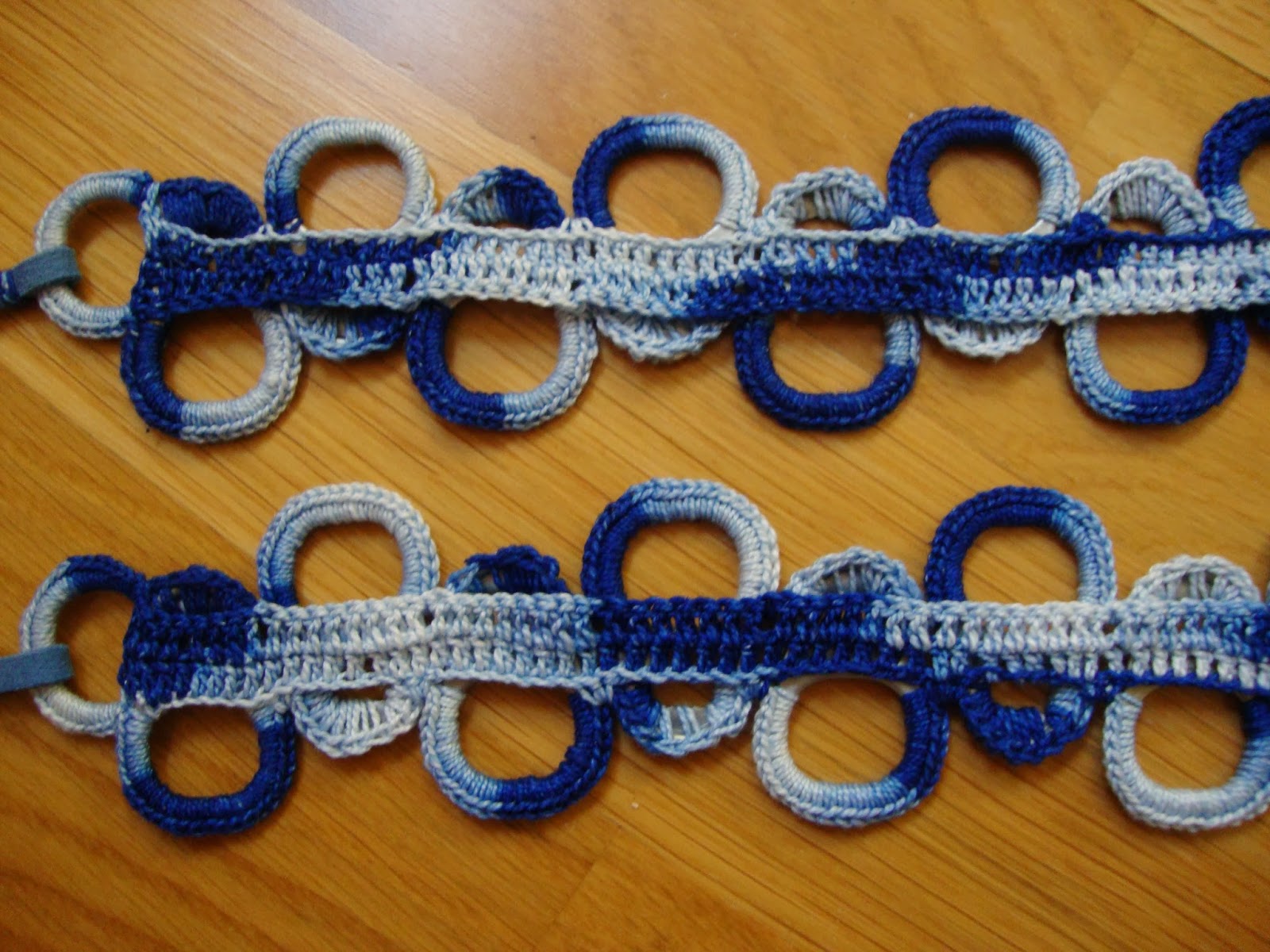 Una vez conseguido las dispuse hasta tener la longitud deseada. Es bastante ancho para que me sirva en cadera o en cintura porque permite atarlo en el extremo o superponiendo un trozo y con dos nudos (con tanto agujero...no hay problema para enganchar).