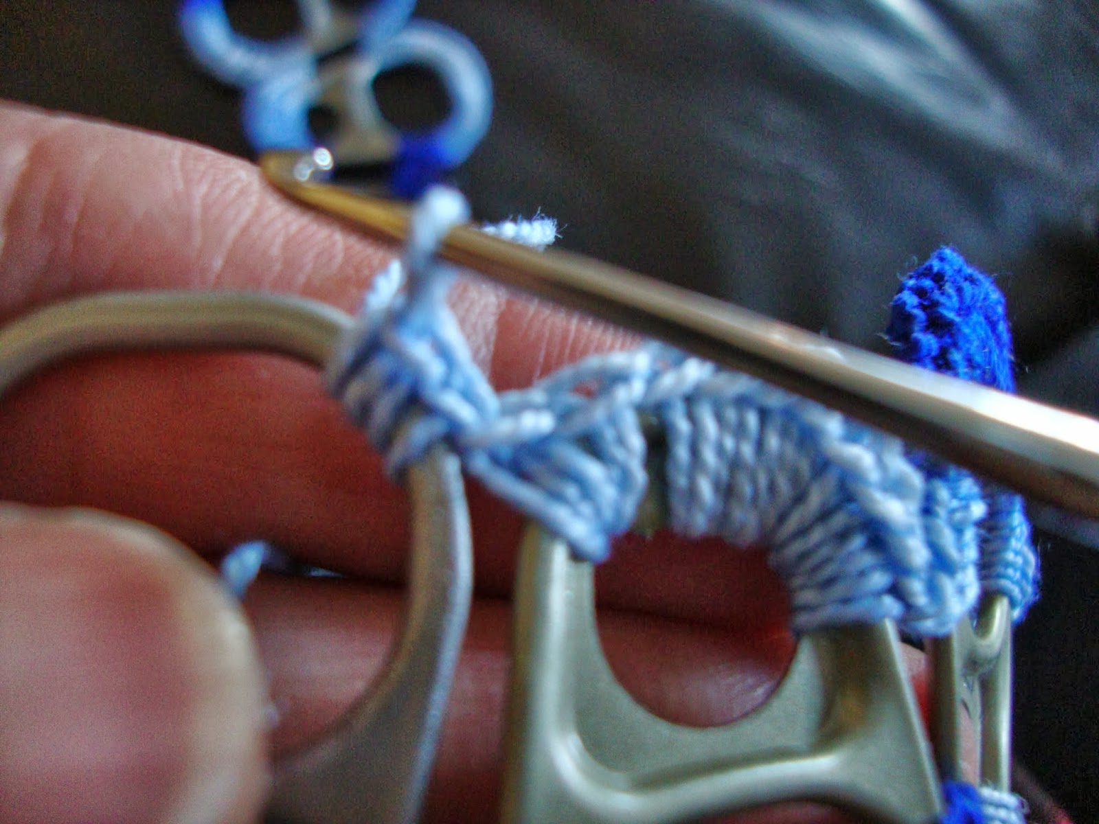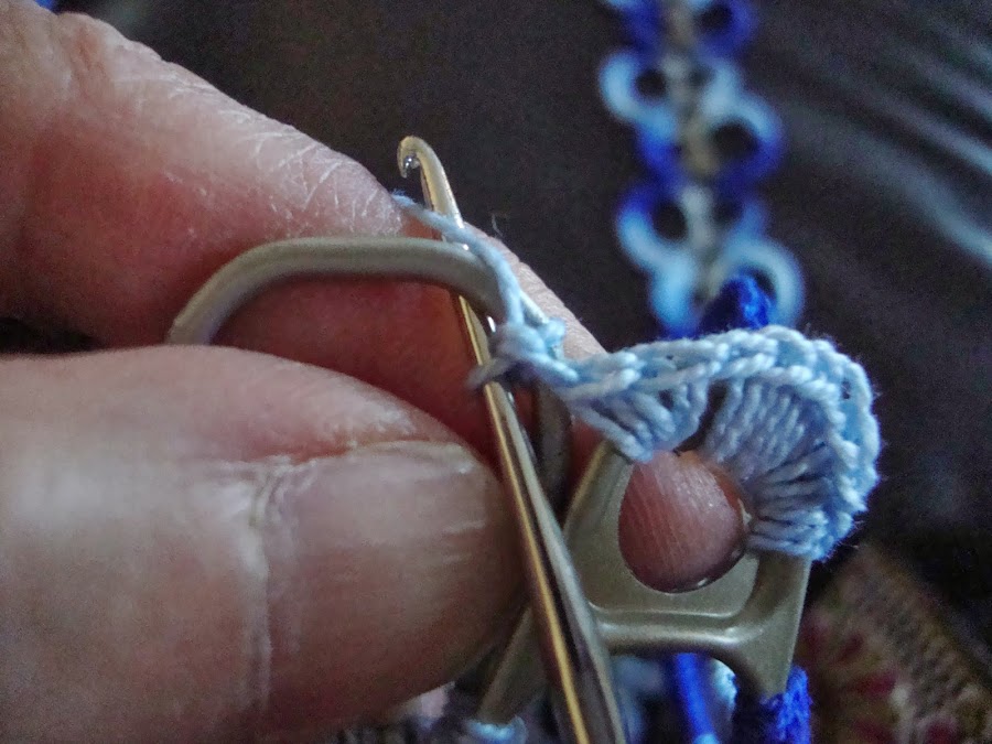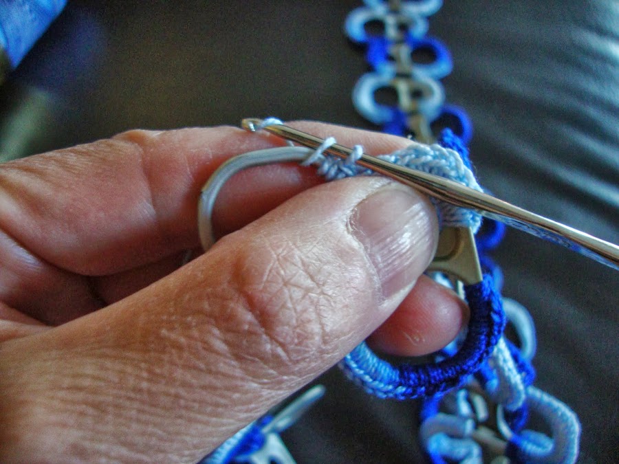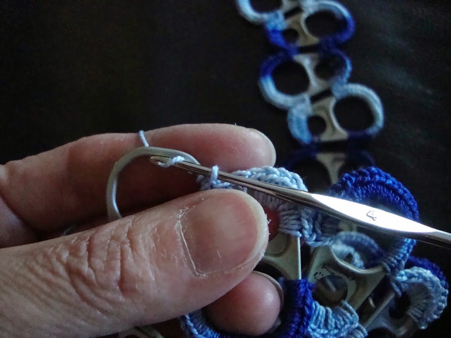 El tejido es como el de otras labores que ya he mostrado con arandelas de lata o con arandelas de plástico. Son puntos bajos que se tejen enganchando la hebra por dentro de la arandela y sacándola hacia nosotras para cerrarlo por arriba de la misma.