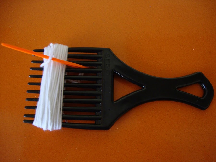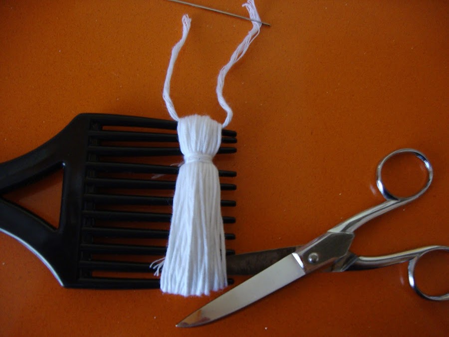 Si nunca habéis hecho borlas, la técnica es similar a la de los pompones. Nos tenemos que ayudar de una base de cartón o con un peine que nos facilita las maniobras de modo sencillo.