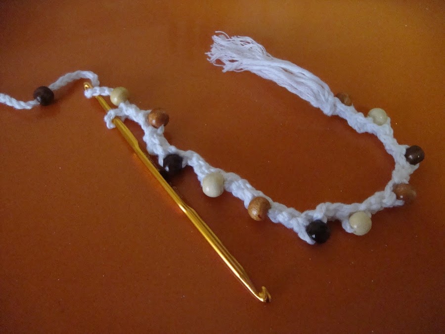 En este cadeneta inicial fui enhebrando abalorios de madera de 3 colores diferentes, y con ella hice la segunda cadeneta con un ganchillo más grueso, tejiendo 2 puntos de cadeneta con el cordón solo y en el 3º enganchando un abalorio como muestro en la foto. Así toda su longitud.