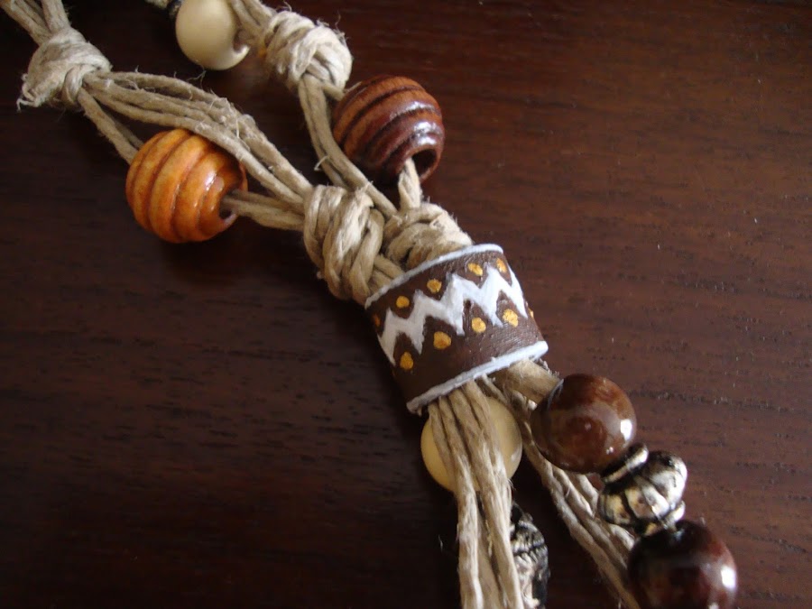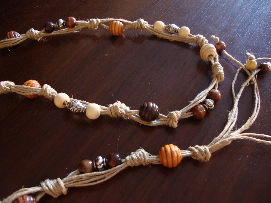 Se trabaja con nudos simples con todas las cuerdas a la vez. El primero lo hacemos dejando una distancia libre de cuerdas que serán los flecos del final (a gusto). Yo fui alternando grupos de un abalorio de madera grande solo y otro de tres, combinando dos más pequeños de madera y uno metálico, en diferentes tonos pero siguiendo una secuencia que se repite a lo largo del cinturón (se pueden hacer multitud de combinaciones en función del resultado que estemos buscando).