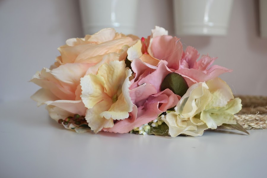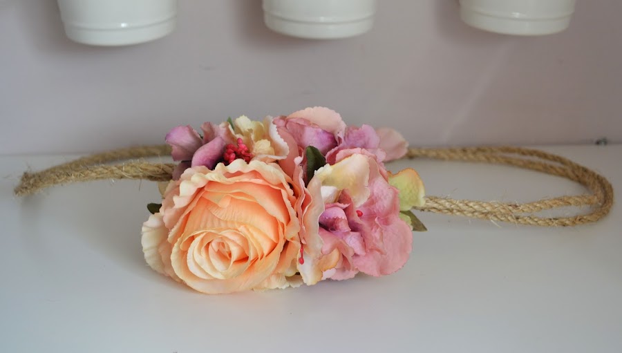El cinturón es un conunto de flores que se colocan en el centro de la cintura. Está formado por una rosa en tono naranja clarito y unas hortensias rosas palo. Para atarle, he colocado una bonita cuerda envejecida con unas hortensias rematando las terminaciones de los rabos.