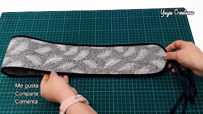 Antes de voltear el bies para ya colocarlo del derecho, vamos a ubicar la cinta de raso en los extremos, justo en el centro. La cinta ya la hemos cortado en dos previamente, es decir, usaremos 50 cm de cinta para cada lado del cinturón.