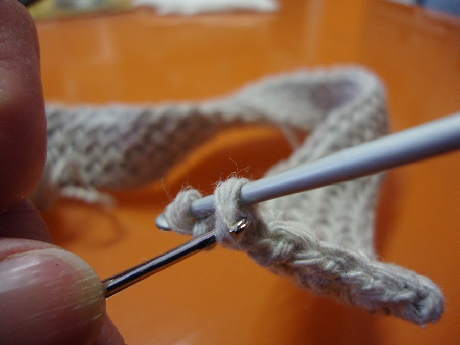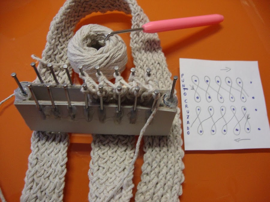 Una vez alcanzada la longitud deseada, vamos extrayendo los puntos del telar y pasando uno por dentro de otro (con ayuda de dos ganchillos), de dos en dos hasta completar la fila, para rematar todo el borde.