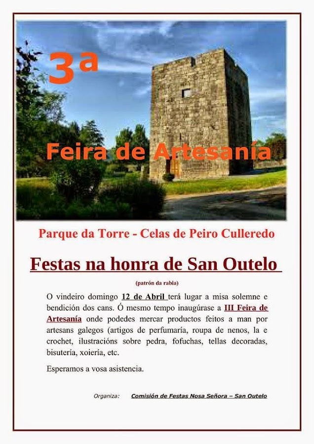 El domingo a partir de las 12:00, en Celas de Peiro (Culledero), dentro de los actos programados en honor a San Outelo tendra lugar una feria de artesanía.