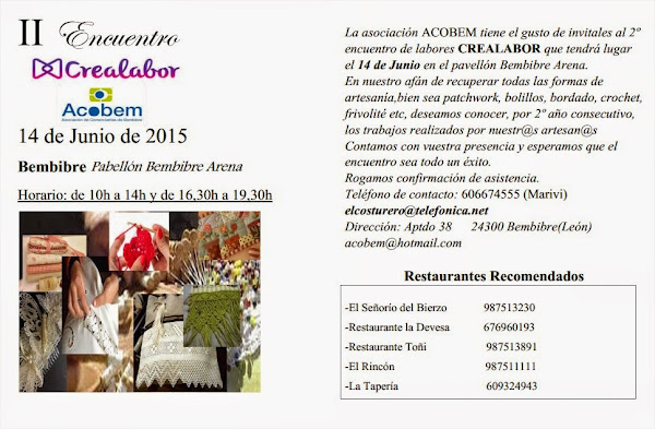 El sábado 13 hay encuentro de bolillos en: Ubeda (Jaén); Brihuega (Guadalajara); Castellar del Valles (Barcelona); Canet de mar (Barcelona); Sant Boi de Llobregat (Barcelona); Zaragoza-Torrero y Mairena del alcor (Sevilla)