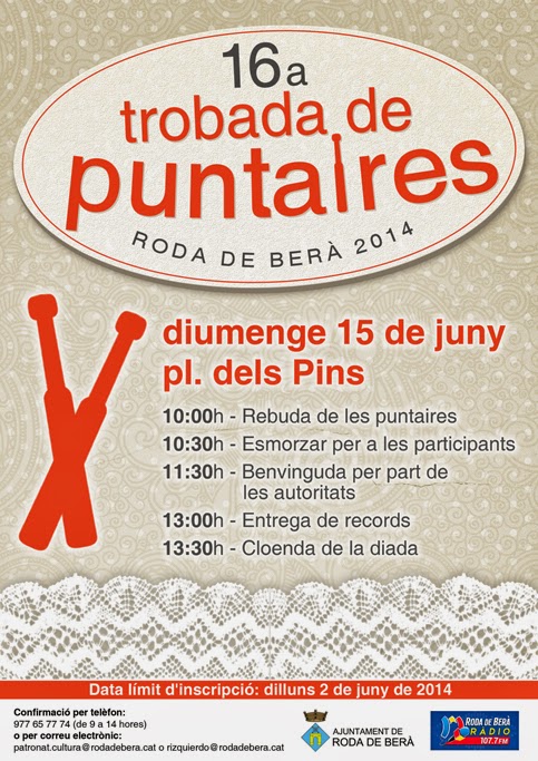 El domingo también tenemos mucho para ver y disfrutar. Tenemos encuentros de bolillos en: Pedreger (Alicante); Polop (Alicante); San Antoni de Calonge (Gerona); La Pobla de Claramunt (Barcelona); Tiana (Barcelona); Gandesa (Tarragona); Mas de las matas (Teruel); Roda de Bara (Tarragona) y La Bisbal D"Emporda (Gerona)
