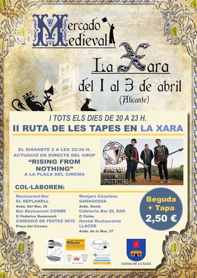 La Xara (Alicante) este fin de semana celebra un Mercado Medieval donde además de disfrutar de la gastronomía, podremos comprar productos artesanales, ver los espectáculos de música programados, y participar en numerosas actividades para toda la familia como talleres de cerámica, alfarería, pintacaras, juegos de títeres, juegos populares y muchas cosas mas.