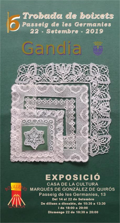 Uno de los encuentros a los que me ha gustado siempre asistir, y en muchos casos participar como bolillera, es el de Gandia (Valencia). Además de coincidir y poder compartir este bello arte con muchas amigas de la zona y de otras zonas de España, ver la exposición de las encajeras de la Asociación de bolilleras de Gandia es toda una gozada por su originalidad y puesta en escena. Porque no es solo que expongan unos trabajos espectaculares, sino que además tienen mucho gusto a la hora de organizarlos y acompañarlos con elementos auxiliares para realzar los encajes.