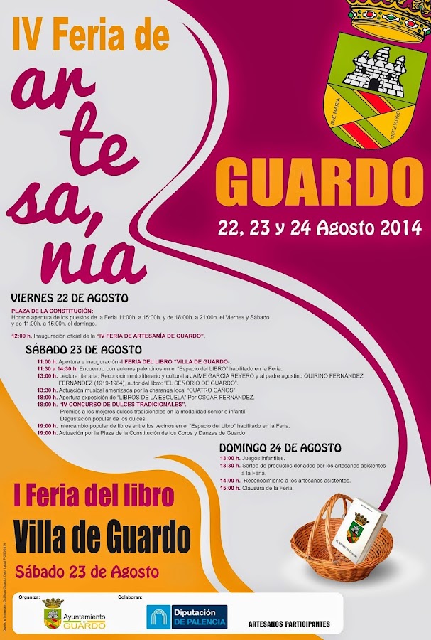 Del 22 al 24 de agosto (ambos inclusive) se celebra en Guardo (Palencia) la IV Feria de artesania donde una treintena de artesanos nos mostraran sus trabajos. La variedad de artesanos, irán de varias provincias, refleja la variedad de productos que podremos ver y comprar: bisuteria, calzado, talla de madera, libros en miniatura (para llevarlos a cualquier parte y no tener escusa para no leer), jabones y por supuesto productos alimentarios como chorizo, quesos...