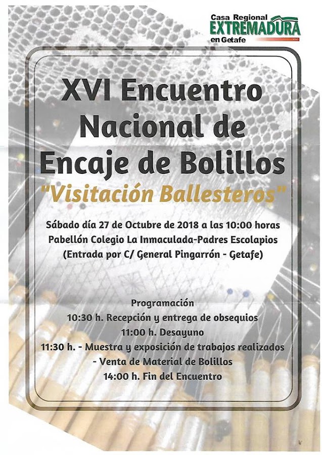 En lo referente a los encuentros de encaje de bolillos, el sábado se celebrarán en: Getafe (Madrid) y Sant Cugat del Valles (Barcelona)