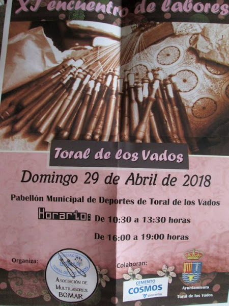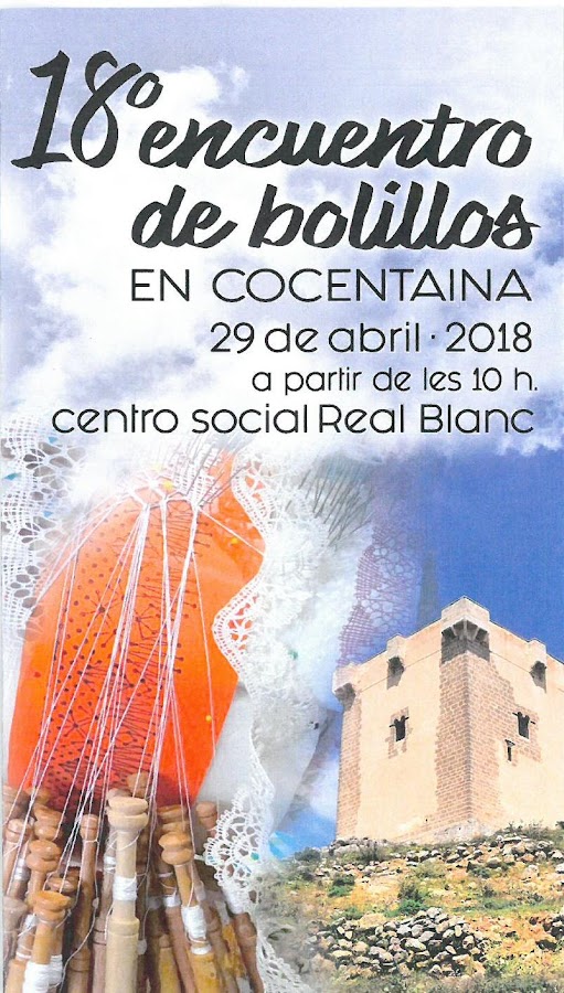 El domingo se celebra el encuentro de bolillos en Cocentaina (Alicante) pueblo donde resido, y aunque este año no participo en la organización, si estaré en el encuentro junto a mis compañeras encajeras y por supuesto os invito a visitarnos si no os habéis inscrito para participar. Comentaros que se ha cambiado el lugar de emplazamiento, este año no es en el Palau Comtat sino en el Centro Social situado en la calle Real Blanc numero 1.