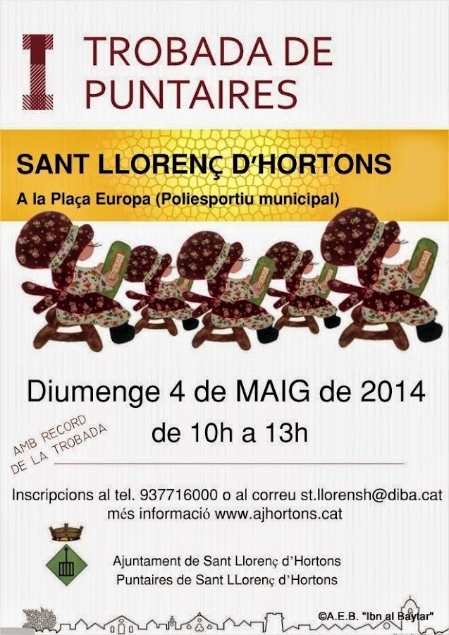 Y el domingo 4 de mayo también se celebraran un buen numero de encuentro de bolillos. Entre ellos los de: Roca del Valles-La torreta (Barcelona); Ballobar (Huesca); Xilxes (Castellon); Figueres (Gerona); Sant Llorenç D"Hortons (Barcelona); Castelldefels (Barcelona); Sant Vicenç de Torello (Barcelona) y como ya os he comentado en Orxeta (Alicante)