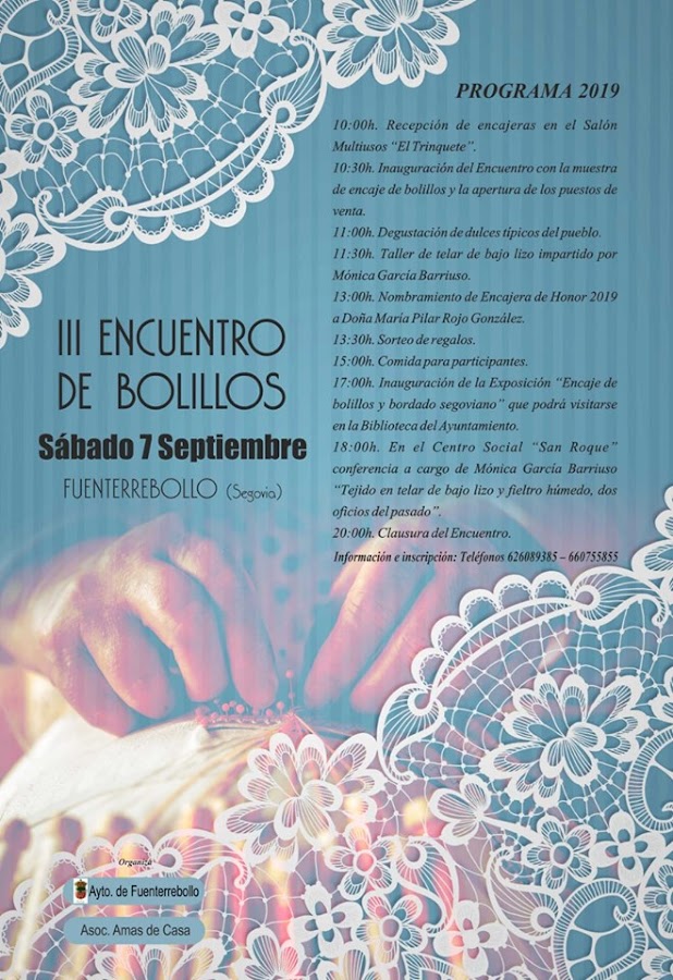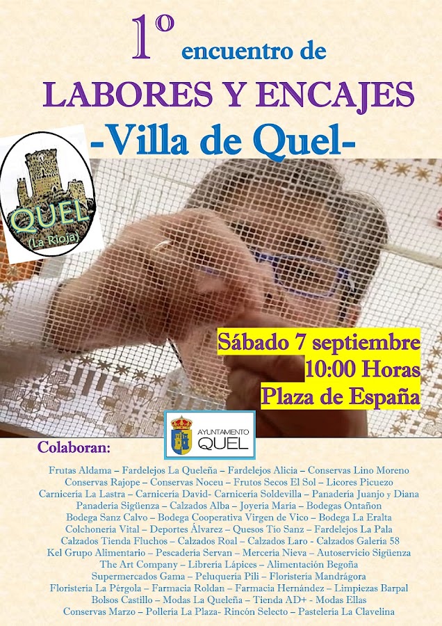 Las encajeras bolilleras de Quel (La Rioja) se han animado y el sábado van a celebrar su primer encuentro que además de encaje de bolillos incluirá otras labores. Desde aquí les mando mis mejores deseos para que salga todo lo mejor posible, no será tan perfecto todo como ellas quisieran y han planeado, pero ya sabemos que no todo se puede controlar y siempre sale algún imprevisto que nos ayuda a mejorar en los siguiente años. Así que espero que disfrutéis muchísimo y animo.