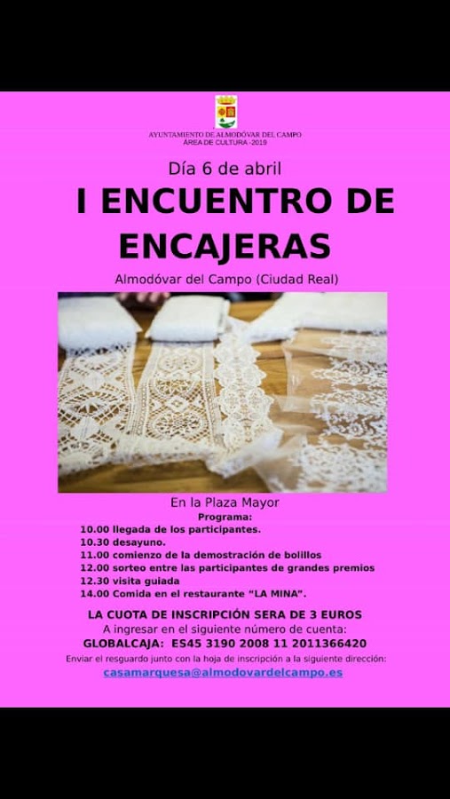 Espero conocer a muchas personas que comparten la afición por el encaje de bolillos y sobre todo me hace especial ilusión conocer a Angel Sanchez de la escuela malagueña, quien el viernes dará una conferencia muy interesante sobre tipos de encajes.