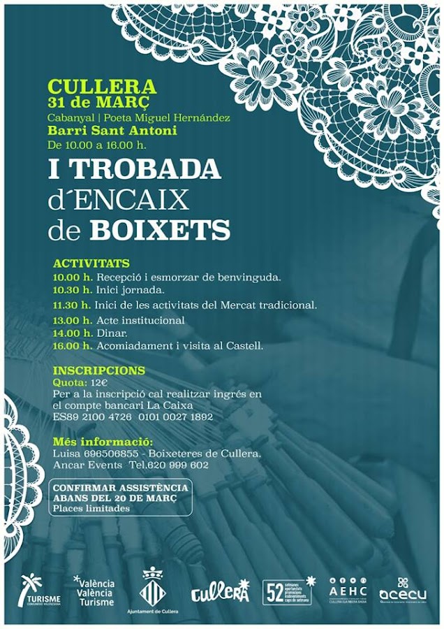 Para el sábado hay programados otros encuentros de bolillos pero os recomiendo que os aseguréis antes de acudir, porque puede que alguno se haya aplazado por amenaza de lluvia. Este es el caso del encuentro de la Font de la Figuera (Valencia) que ha sido pospuesto para el sábado día 13 de abril.