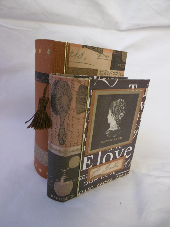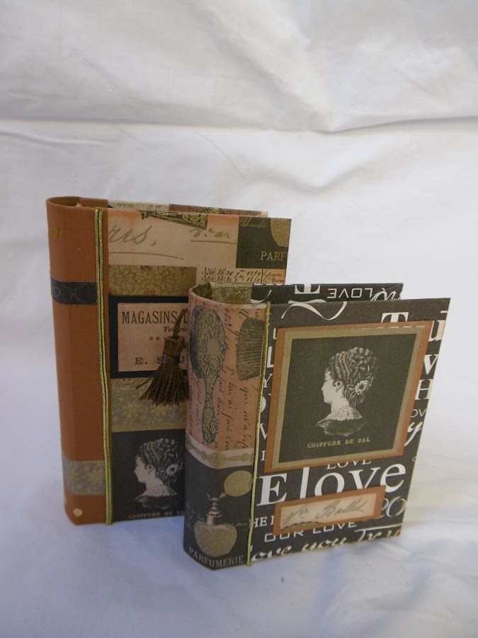 Como en el anterior tutorial hice un primero muy ajustado a las medidas y y materiales similares (el de arriba)use papel de srap para la portada y papel de encuadernar en el lomo, las tarjetas de adorno son recortes del papel de encuadernar, Un hilo dorado y una borla en el lomo completaron la decoración. En el segundo el lomo lo hice con tela de encuadernar y la portada papel de encuadernar, los adornos del lomo son papel de encuadernar y rub-on. En en la portada cordón dorado doble y un trocito de papel de encuadernar sobre fondo de cartulina negra.
