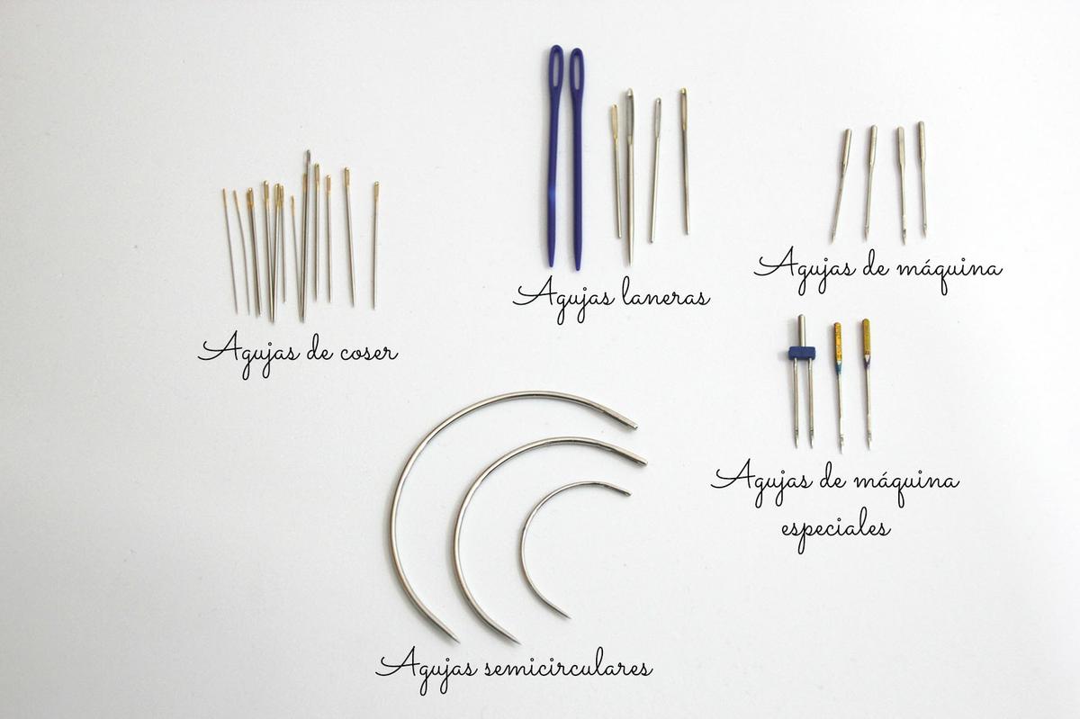 Agujas de costura: Hay una gran variedad de agujas atendiendo a su tamaño y al tamaño del agujerito superior, las más habituales son las del número 8 ó 9. A medida que vamos aumentando de número son más finas y más alargadas. La elección de la aguja dependerá del tipo de tejido que vamos a coser con ella, cuanto más largas y más finas, será mejor para telas de delicadas y ligeras, ya que no se quedarán marcados los agujeros en la tela. Para aquellas personas con mala visión, hay agujas que disponen del agujero superior de mayor tamaño.