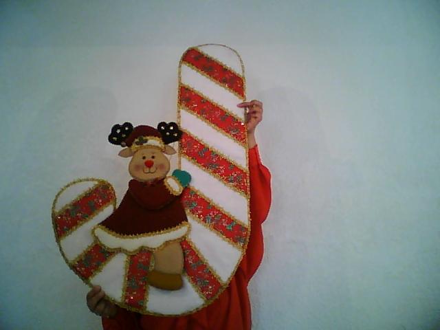 Polar, fieltro, galón, hilo dorado, pick y delcrón. Mide 70 cms de alto. Esta pieza requiere de bastante relleno, por lo que pesa y para darle soporte se requiere de una base plana para el cuerpo, ela ...