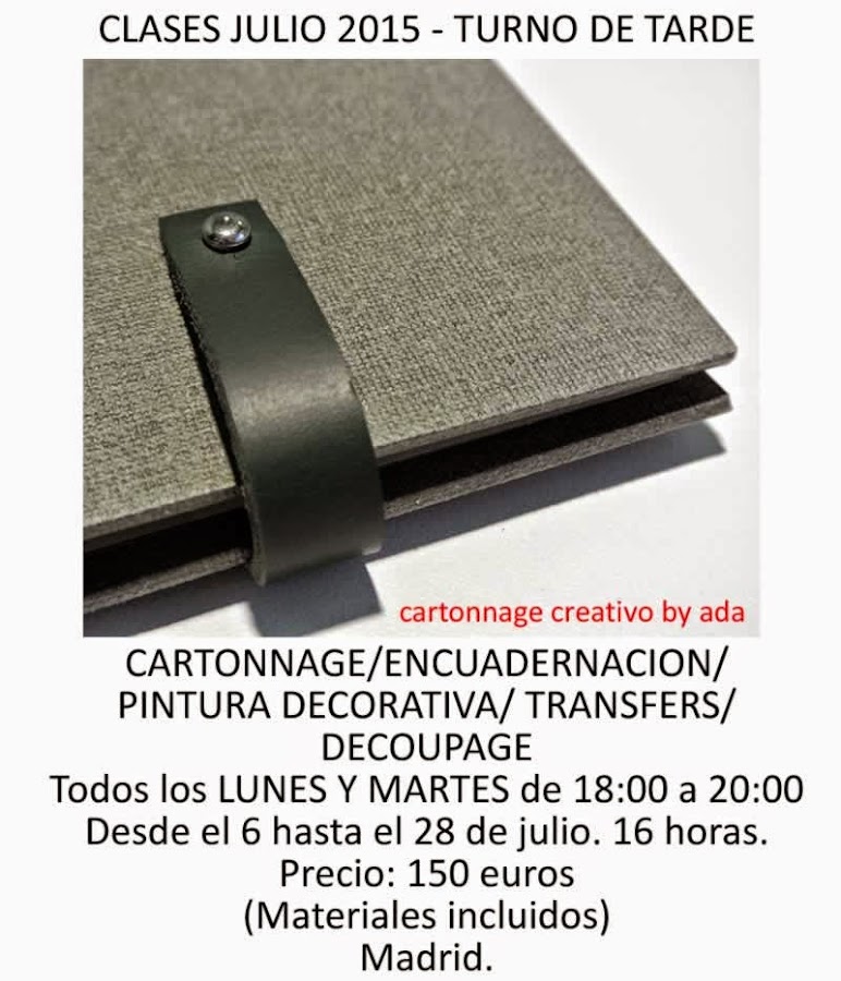 El mes de JULIO en el estudio va a ser muy divertido. Todos los lunes y martes tendremos clases. Podremos aprender cartonnage, encuadernación creativo, pintura decorativa, decoupage, etc.... Muchas de vosotr@s me lo habéis pedido y aquí están las clases intensivas para el mes de julio. Para hacer la reserva, solo tenéis que escribirme un mail a adamunoz@telefonica.net diciéndome que turno queréis y os explico el proceso de reseva.Podéis aprender a hacer los proyectos que más os gusten o que más os interesen. Cada alumno hace sus propios proyectos.