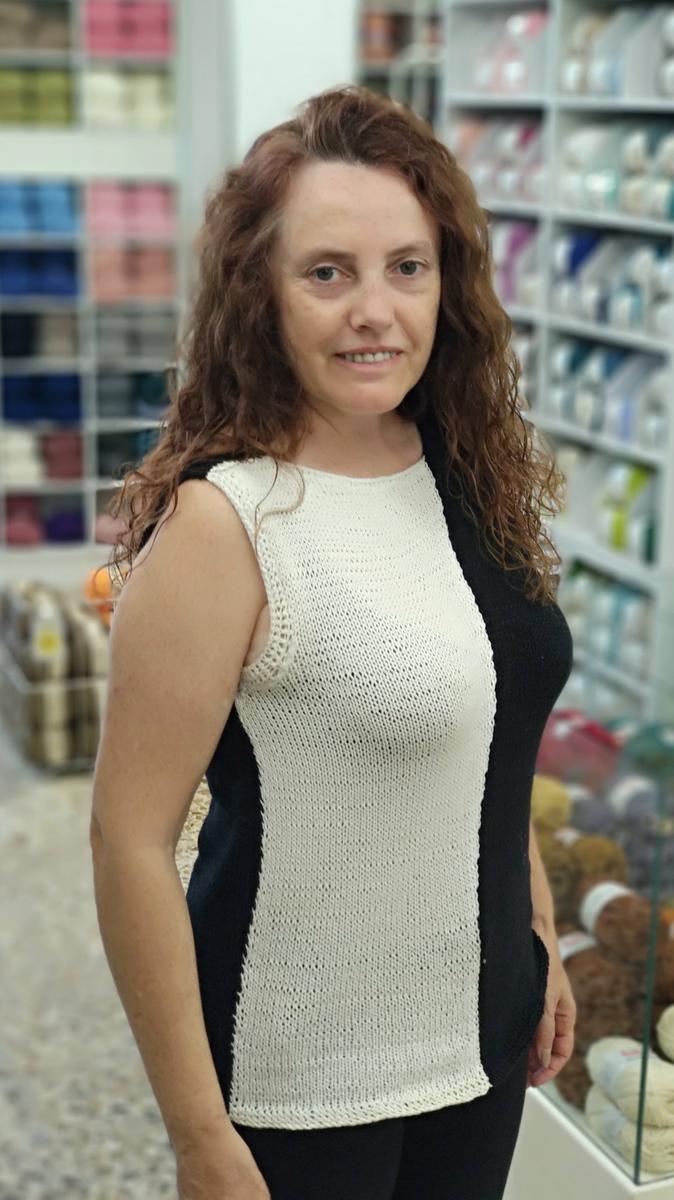 Este Jersey lo he hecho a punto liso, lo único que hay que ir uniendo el color blanco y el negro para que vaya a dos colores. Luego voy inclinando la línea había la izquierda hasta llegar al cuello.