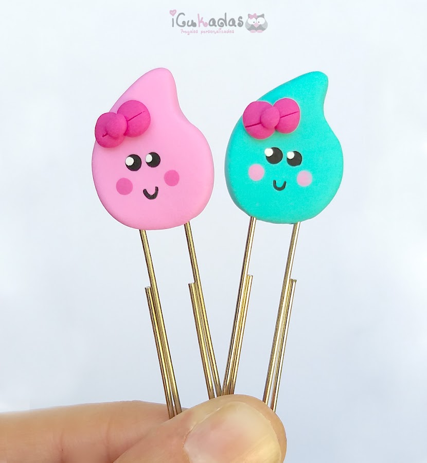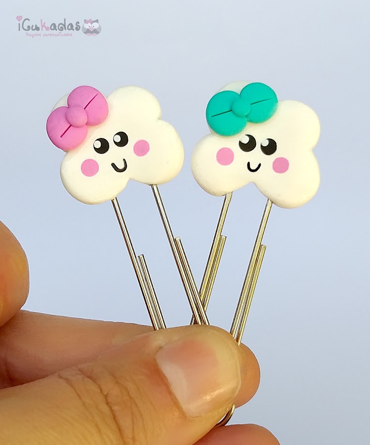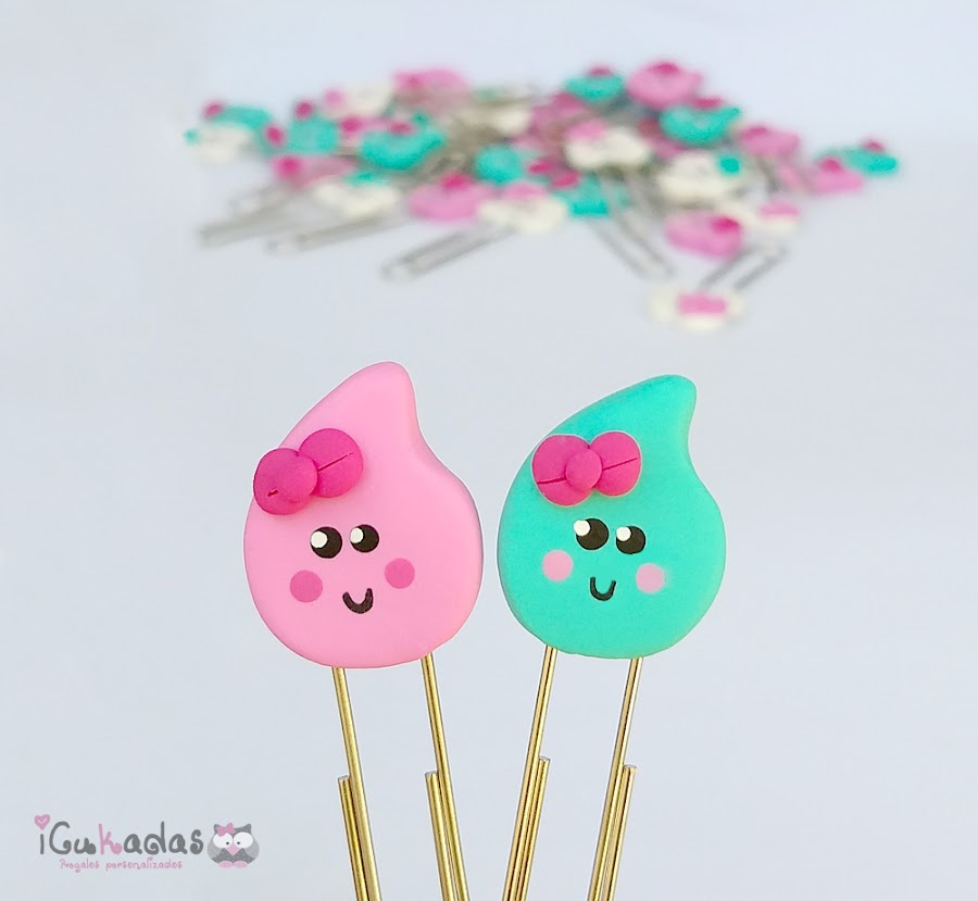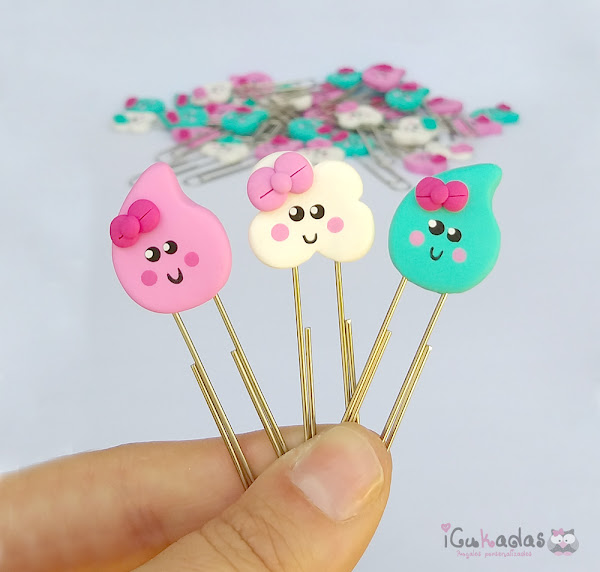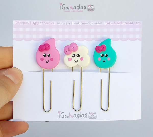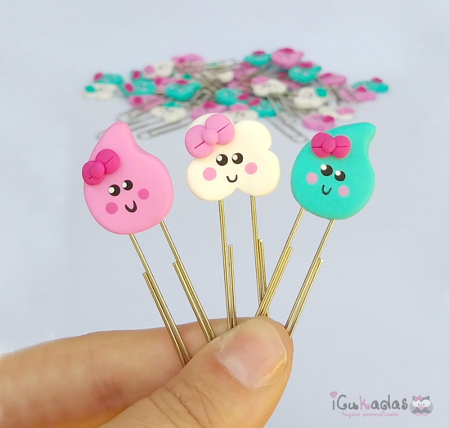 Unos clips de nubes y gotas de agua, en mint y rosa.