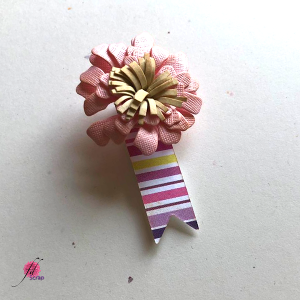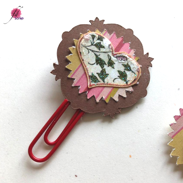 Para este segundo clip he usado un troquelado con la silhouette, el círculo con puntas, una flor que ha sido troquelada con un die de sizzix y un pequeño corazón, el cual me llegó en un intercambio. Los dos primeros troquelados en cartulina con diseño y el corazón en cartulina blanca.
