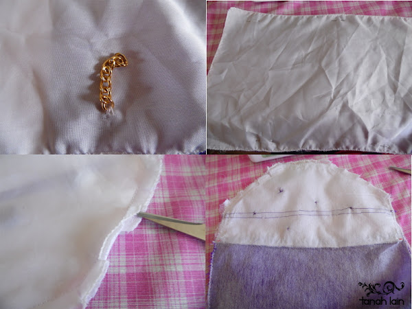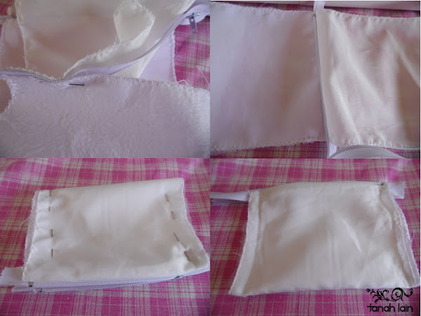Para el cierre ocupe uno mucho más grande para coserlo más fácilmente, cosiendo el cierre en medio del forro y la tela externa, que acomodamos como en la fotografía. Luego volteamos esto por dentro para coser los extremos. Ahora sólo cortamos el sobrante del cierre y damos vuelta y atamos un listón o la cinta con el broche de perico al cierre.