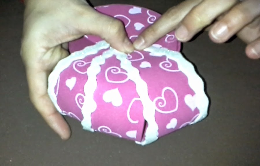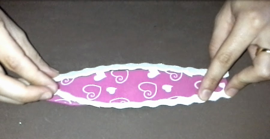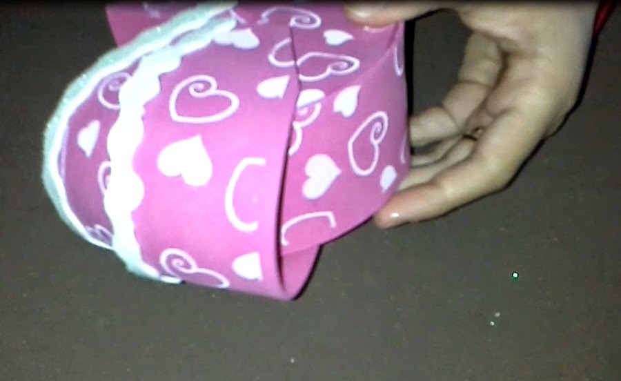 Segundo: Aplicamos pegamento por los bordes interiores de los círculos para pegar la tira de 30cm entre los dos círculos (foto nº 2), de manera que quede una especie de cajita redonda (foto nº 3).