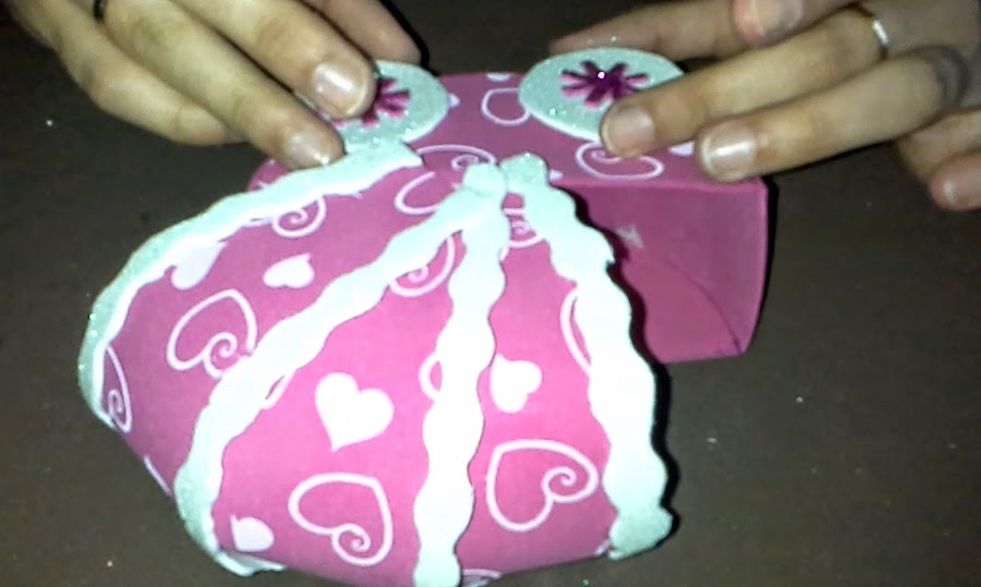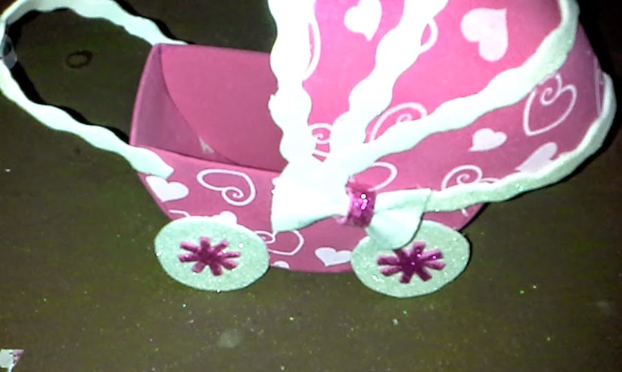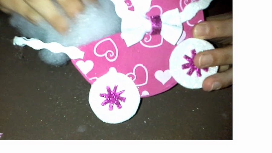 Sexto: Por último haremos la decoración del carrito con dos lazos que colocaremos uno en cada lado y una tira de goma eva para hacer el mango (foto nº11). Colocar el relleno para peluches y los caramelos dentro del carrito (foto nº 12).