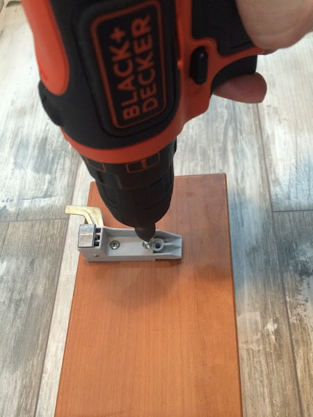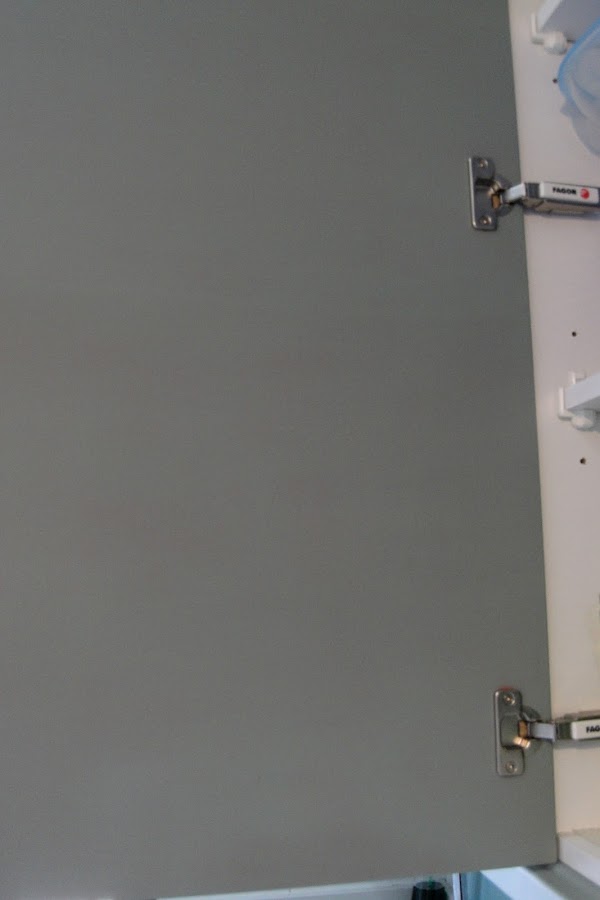 Una vez que esté seco (también seca rapidísimo, esperad que seque entre capa y capa; en mi caso eché dos capas en el exterior de las puertas y embellecedores y tres capas en el zócalo de abajo. En el interior de las puertas eché solo una capa de barniz) ya podéis poner las bisagras y tiradores.