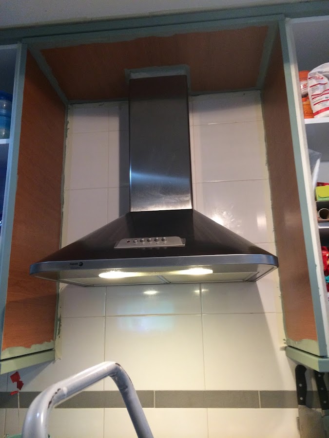 Puertas superiores quitadas y embellecedores y laterales de la campana con dos manos de pintura y barnizados.